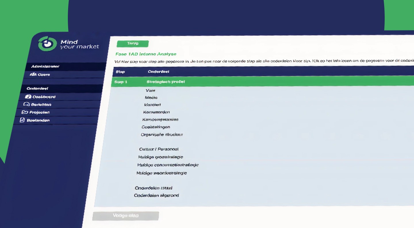 De strategie-tool van Mind your market helpt u scherp zicht te krijgen op de strategische positie van uw organisatie. U ontdekt stap voor stap waar kansen liggen, welke knelpunten aandacht vragen en welke richtingen het meest kansrijk zijn. Zo maakt u onderbouwde keuzes voor de toekomst. Bovendien heeft u direct inzicht in actuele stuurinformatie en strategische documenten – overzichtelijk en praktisch in één tool.